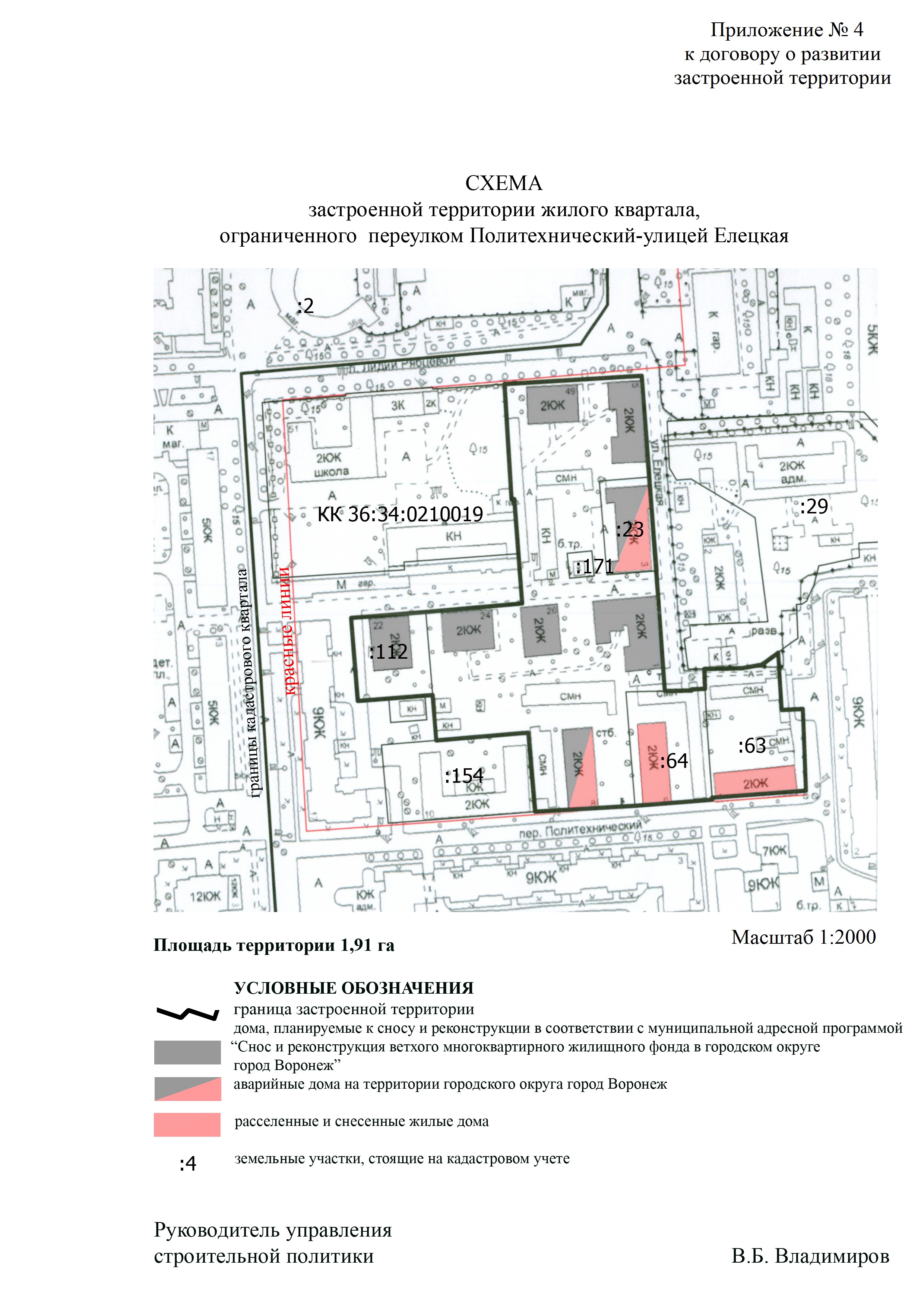 1) сведения о местоположении и площади застроенной территории, в отношении которой принято решение о развитии, перечень адресов зданий, строений, сооружений, подлежащих сносу, реконструкции: застроенная территория ориентировочной площадью 1,91 га, ограниченная переулком Политехнический - улицей Елецкая в городском округе город Воронеж.