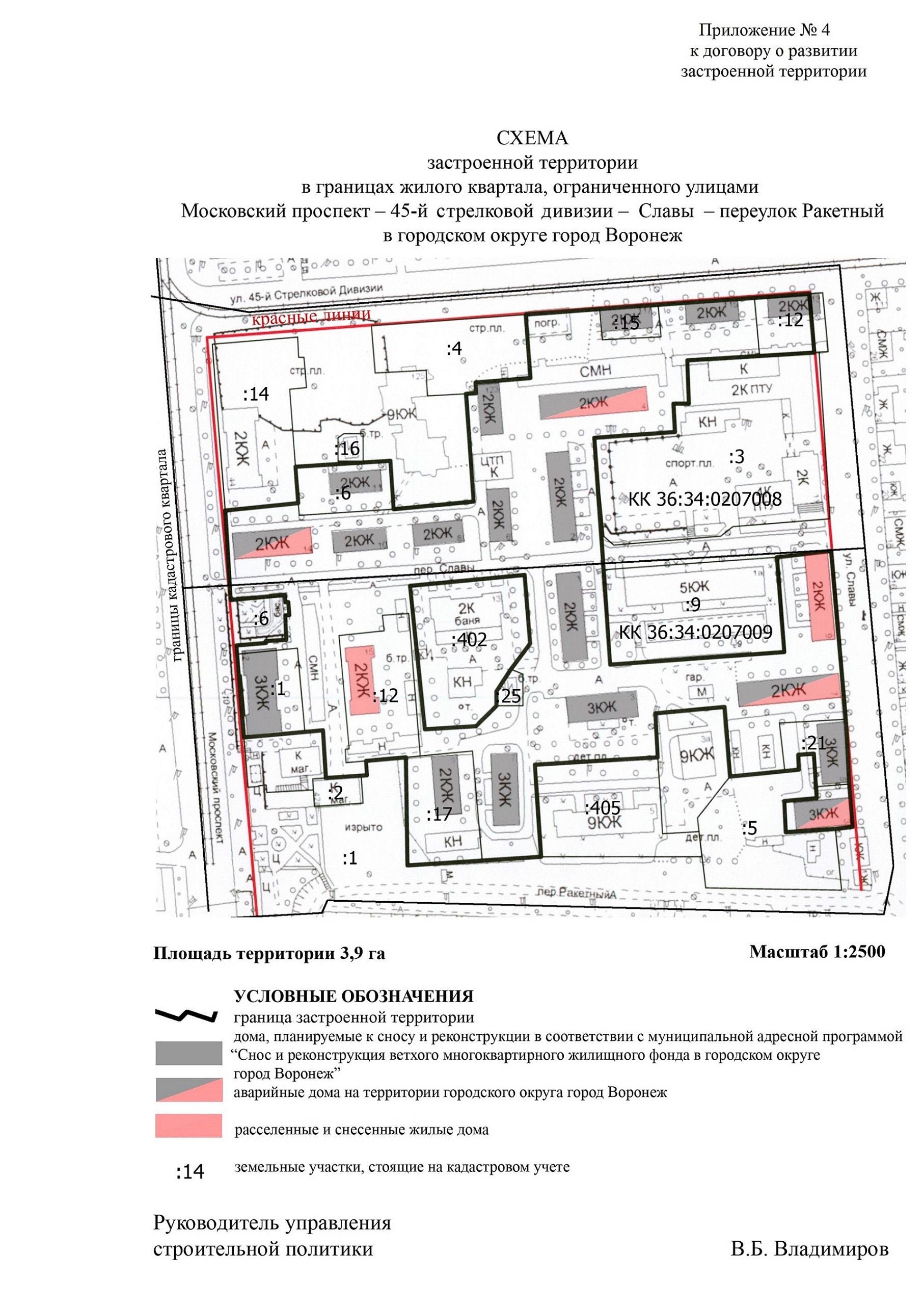 1) сведения о местоположении и площади застроенной территории, в отношении которой принято решение о развитии, перечень адресов зданий, строений, сооружений, подлежащих сносу, реконструкции: застроенная территория ориентировочной площадью 3,9 га, ограниченная улицами Московский проспект – 45-й стрелковой дивизии – Славы – переулок Ракетный в городском округе город Воронеж.